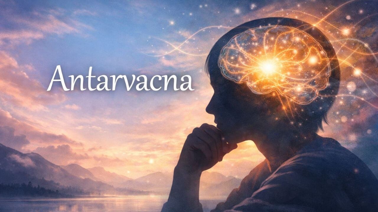 Antarvacna means inner speech or inner dialogue. It is the silent conversation happening in your mind throughout the day. It helps with thinking, planning, and understanding emotions. Everyone experiences it naturally.